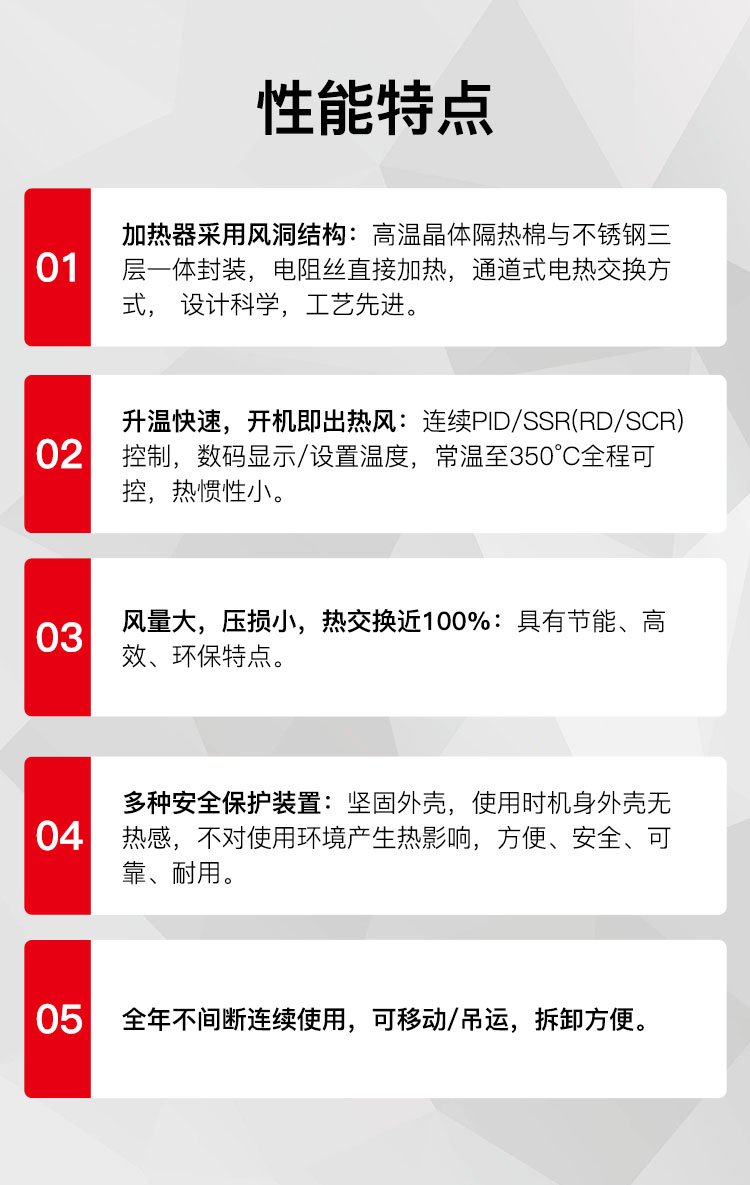 ③熱風(fēng)在出口溫度為200°C時(shí),發(fā)熱絲表面溫度僅350°C而已,這種熱交換率讓本產(chǎn)品達(dá)到其它加熱器無(wú)法達(dá)到的要求。
