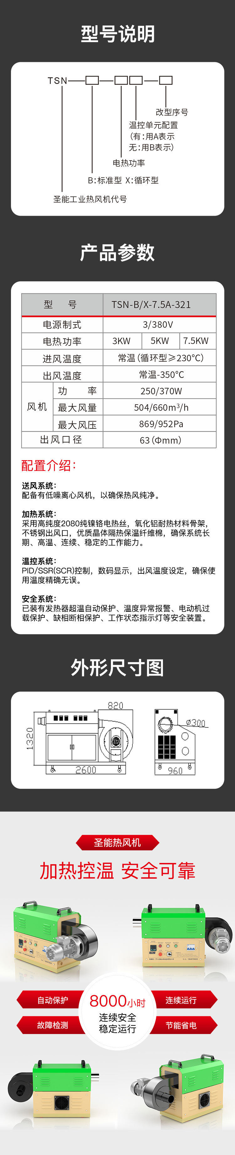 “TSN”工業(yè)熱風(fēng)機(jī)主要由送風(fēng)系統(tǒng)、加熱系統(tǒng)、溫控系統(tǒng)三大部分部分組成。通電后,鼓風(fēng)機(jī)把空氣吹送到加熱器里,令空氣從螺旋狀的電熱絲內(nèi)、外側(cè)均勻通過(guò),電熱絲通電后產(chǎn)生的熱量與通過(guò)的冷空氣進(jìn)行熱交換,從而使出風(fēng)口的風(fēng)溫升高。出風(fēng)口處的K型熱電偶及時(shí)將探測(cè)到的出風(fēng)溫度反饋到溫控儀,儀表根據(jù)設(shè)定的溫度檢測(cè)著工作的實(shí)際溫度,并將有關(guān)信息傳遞回固態(tài)繼電器進(jìn)而控制加熱器是否工作。同時(shí),鼓風(fēng)機(jī)可利用風(fēng)量調(diào)節(jié)器(變頻器、手動(dòng))調(diào)節(jié)吹送空氣的風(fēng)量大小。另外,送風(fēng)系統(tǒng)及加熱器,均有過(guò)載超溫自動(dòng)保護(hù)裝置,總電路也設(shè)計(jì)了緊急摯,以保證安全,防止錯(cuò)誤操作。