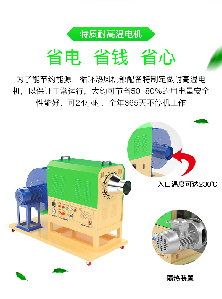 ④為了節約能源,循環型系列熱風機都配備特制定做耐高溫電機,以保證正常運行,大約可節省50-80%的用電量。