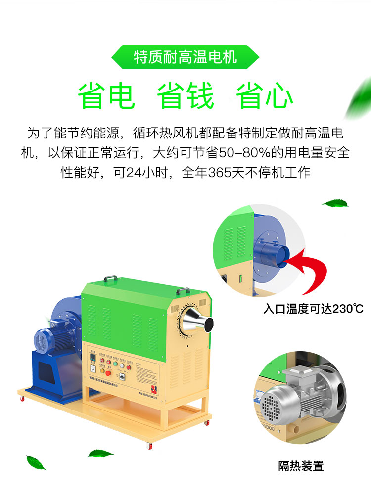 ④為了節約能源,循環型系列熱風機都配備特制定做耐高溫電機,以保證正常運行,大約可節省50-80%的用電量。