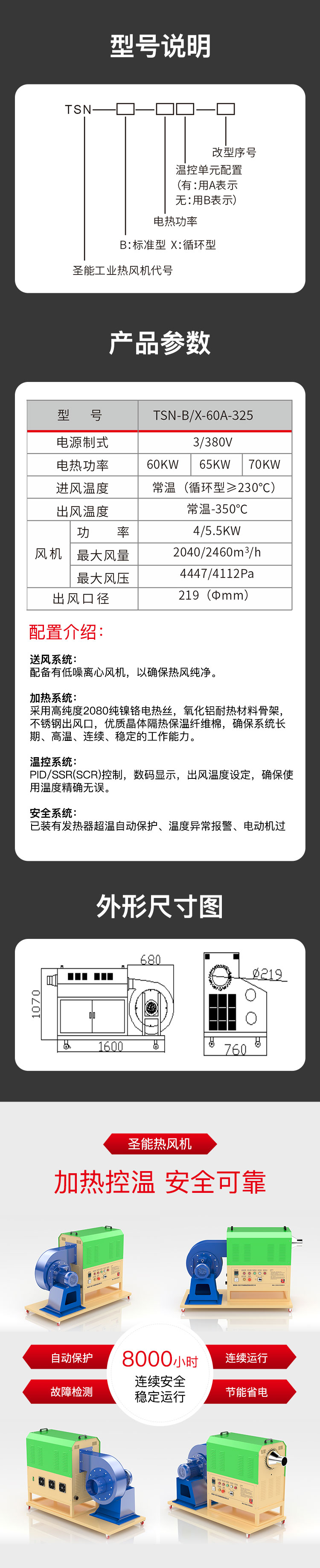 “TSN”工業熱風機主要由送風系統、加熱系統、溫控系統三大部分部分組成。通電后,鼓風機把空氣吹送到加熱器里,令空氣從螺旋狀的電熱絲內、外側均勻通過,電熱絲通電后產生的熱量與通過的冷空氣進行熱交換,從而使出風口的風溫升高。出風口處的K型熱電偶及時將探測到的出風溫度反饋到溫控儀,儀表根據設定的溫度檢測著工作的實際溫度,并將有關信息傳遞回固態繼電器進而控制加熱器是否工作。同時,鼓風機可利用風量調節器(變頻器、手動)調節吹送空氣的風量大小。另外,送風系統及加熱器,均有過載超溫自動保護裝置,總電路也設計了緊急摯,以保證安全,防止錯誤操作。
